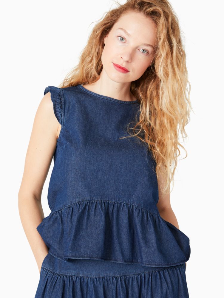 two things we're loving this summer: classic cotton chambray and a bit of flounce. we've combined the two in this top that'll look really good with blue jeans, skirts, shorts, skorts...