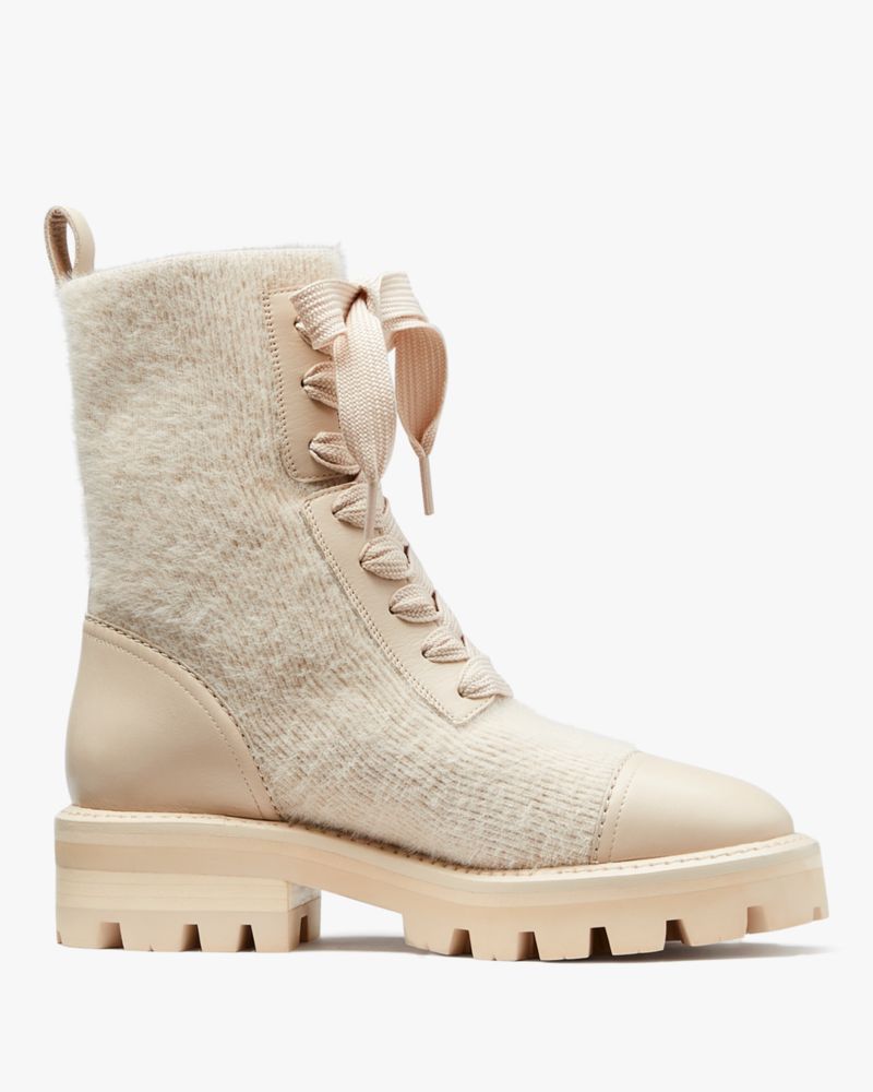 Kate Spade,Winton Lug Booties,Rubber,Knit,Leather,Combat,Bootie,Pull Tab,Day Party,Cream